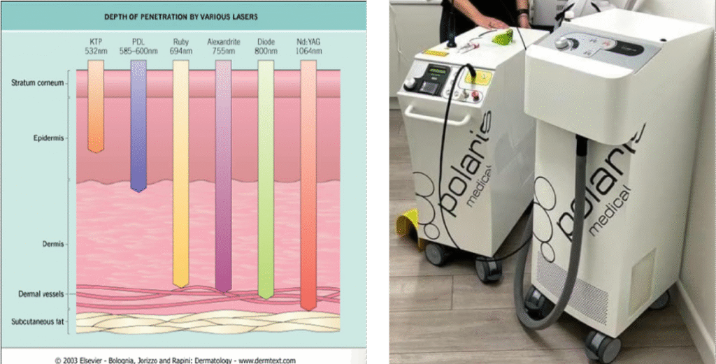 Scientifically backed as one of the safest and most affective lasers on darker skin types, the Polaris Nd yag is a solid state laser offering maximum power to go deeper in the skin to target all active follicles where some lasers struggle to reach. This laser is perfect for all skin types(see references image).